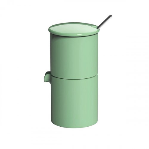 Gaiši zaļš komplekts, kas sastāv no cukurtrauka, krējuma trauka un karotes.