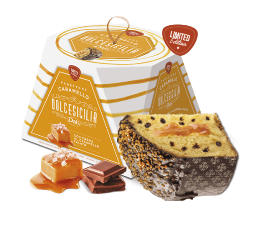 Kūka Dolce Sicilia Panettone ar sāļās karameles pildījumu, tumšās šokolādes skaidiņām, kakao krēma glazūru ar karameles gabaliņiem 800g