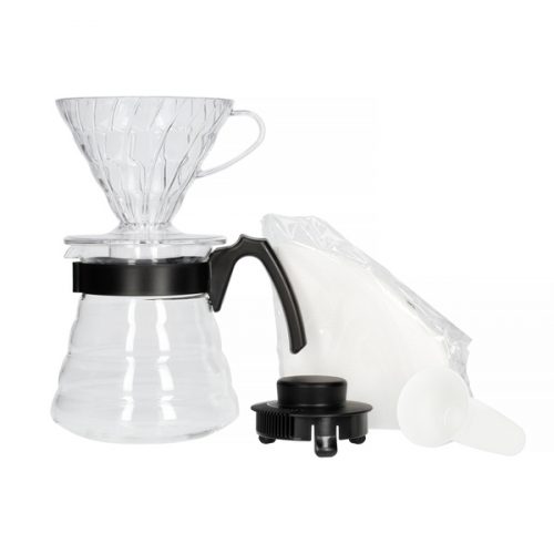 Lielisks sākuma komplekts kafijas pagatavošanai no Hario, kas ietver V60-02 caurspīdīgu plastmasas pilinātāju ar kafijas karotīti, stikla serveri ar ietilpību 600 ml un 40 filtrus.