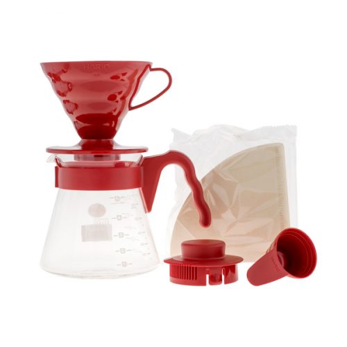 Lielisks sākuma komplekts kafijas pagatavošanai no Hario, kas ietver V60-02 sarkanu plastmasas pilinātāju ar kafijas karotīti, stikla serveri ar ietilpību 700 ml un 40 filtrus.