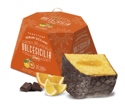 Kūka Dolce Sicilia Panettone ar Sicīlijas citrusaugļu pildījumu, kakao krēma glazūru un tumšās šokolādes drupačām 800g
